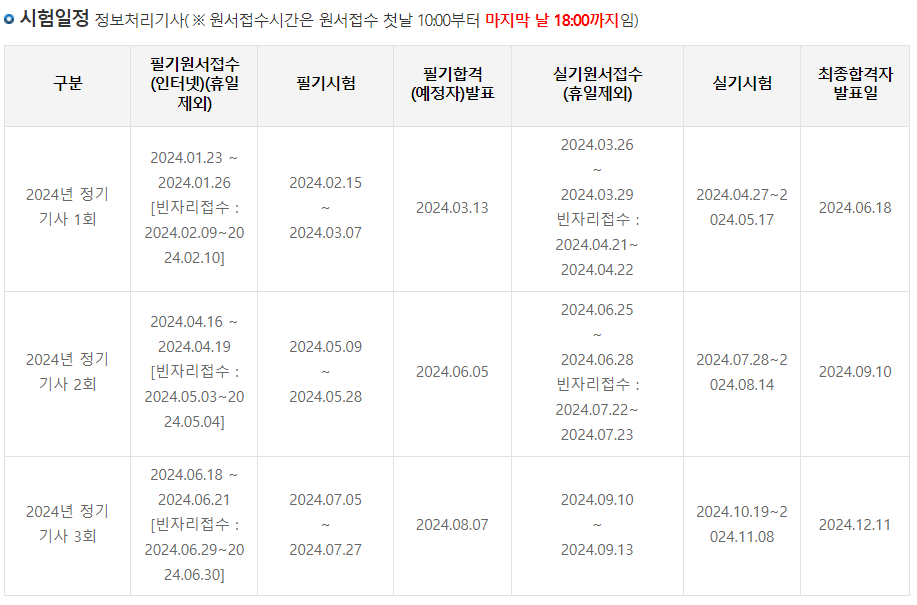 25년도 일정표를 잘 확인하시고 접수 하면 될 것 같다. 정처기 필기시험은 1년에 3번으로 나뉜다.